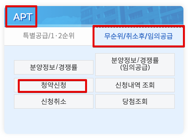 3. [APT] - [무순위/취소후/임의공급] - [청약신청]을 클릭합니다.